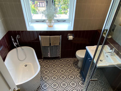 Textures and patterns can be seen in all three bathrooms floors along with shades of green and grey, burgundy and beige, and a quirky wall paper for the cloakroom. Pale white tones were chosen for ceilings and woodwork.